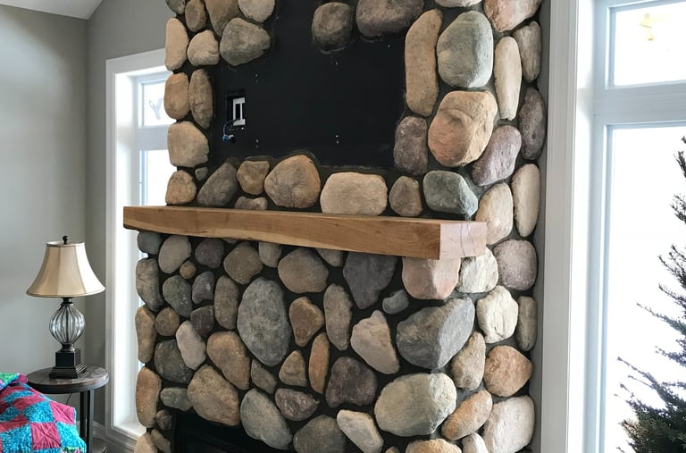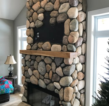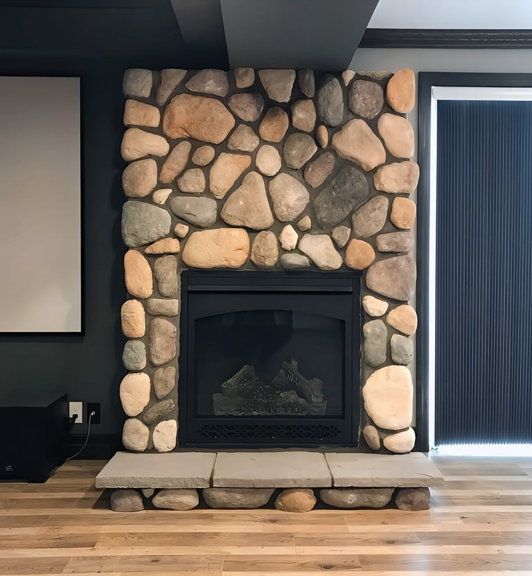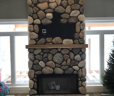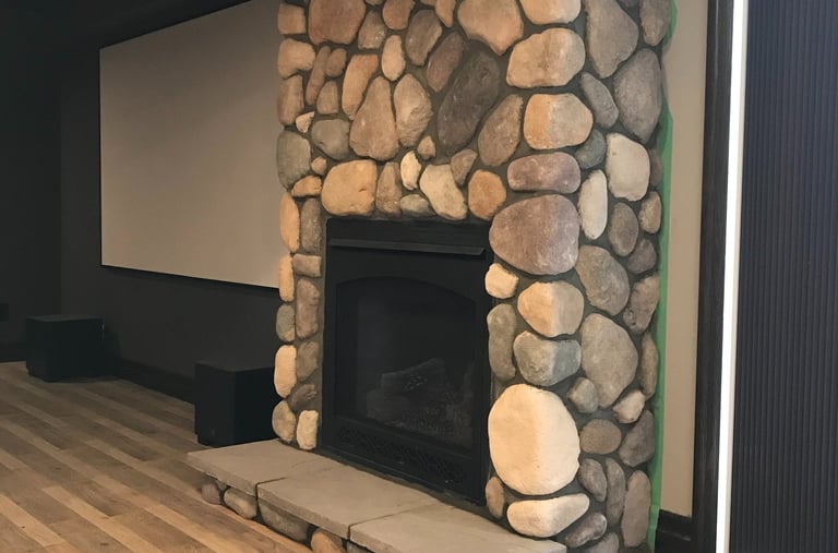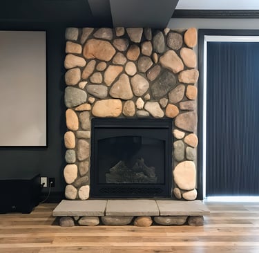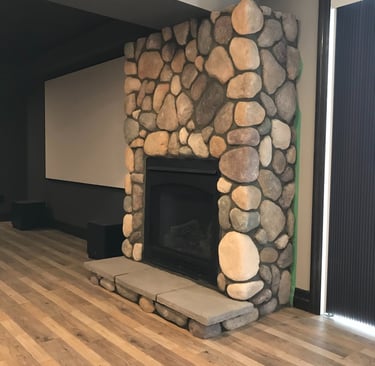 When the contractor called and told us their new client just experienced a house fire and lost everything. We wanted to do our part and help create a beautiful 'cabin' style fireplace(s). This natural stone veneer made a great addition to their beautiful new home renovation. We installed two separate fireplaces on this project: one in the main living room, and the second in the basement home theatre/bar room.